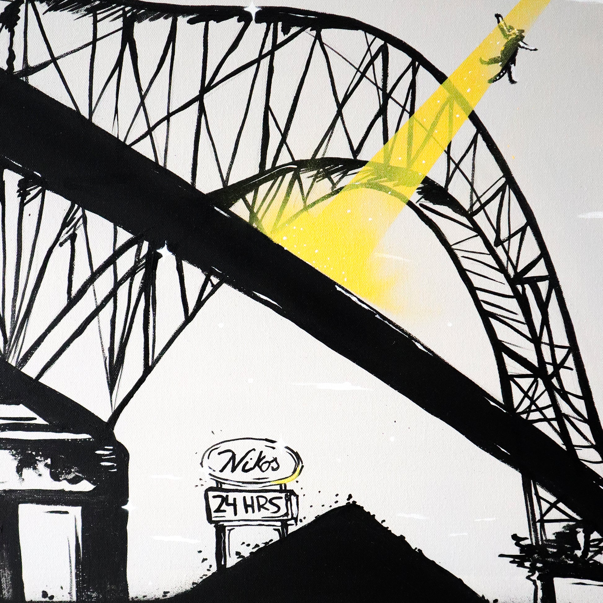 Arte pintado con spray usando técnica de stencil y acrílico sobre canvas.