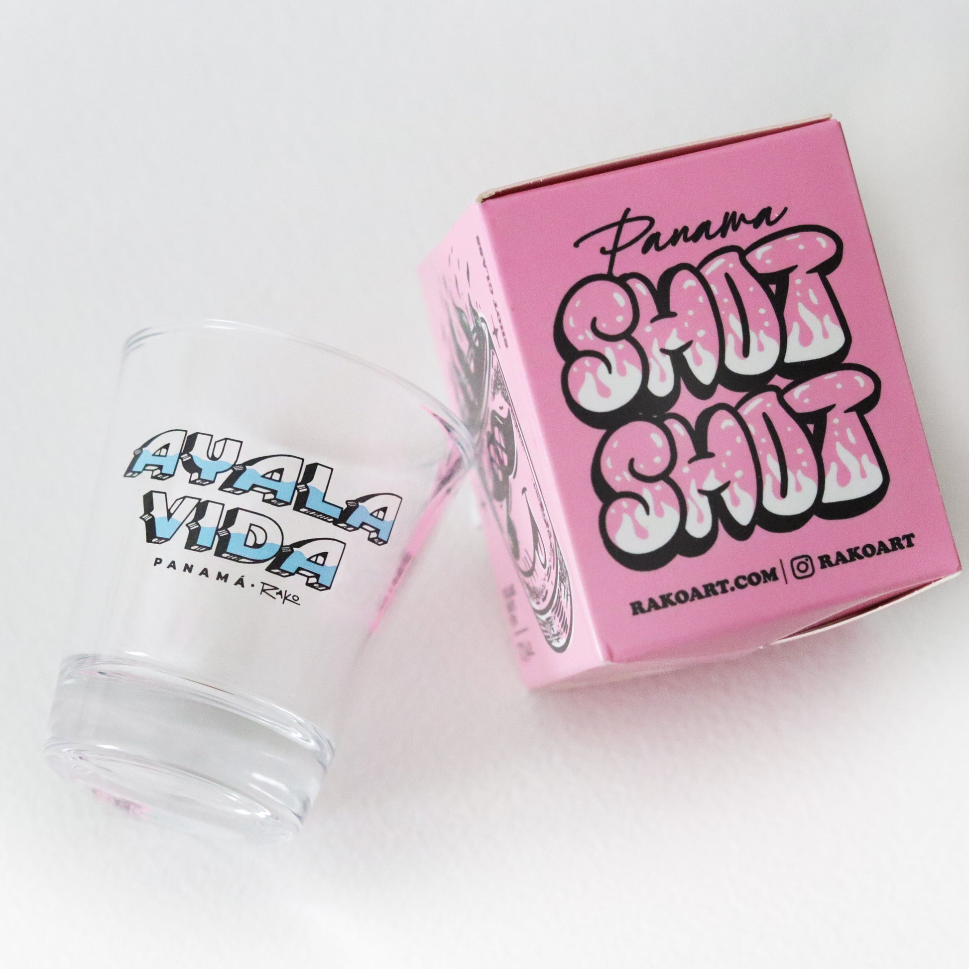 Vaso tipo shot de vidrio de 50ml. Viene con su cajita.