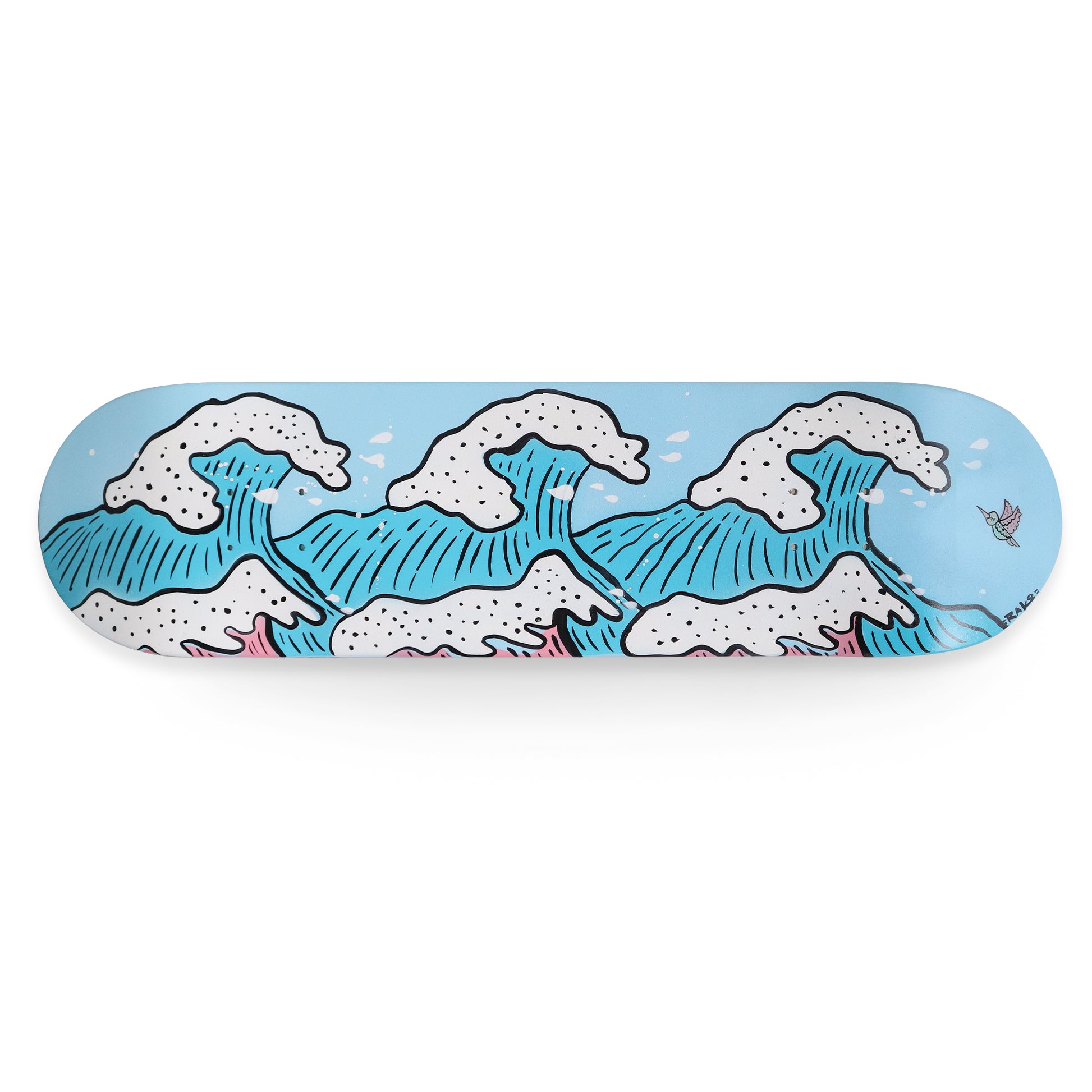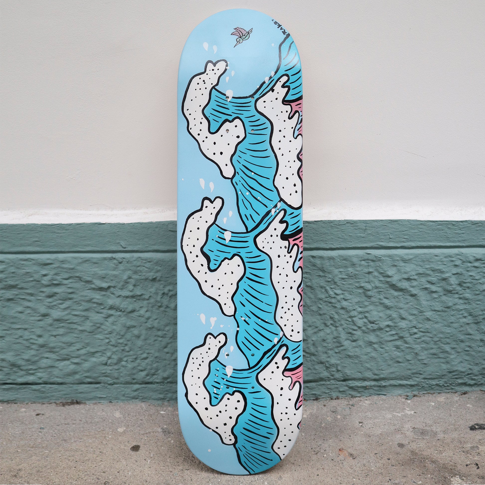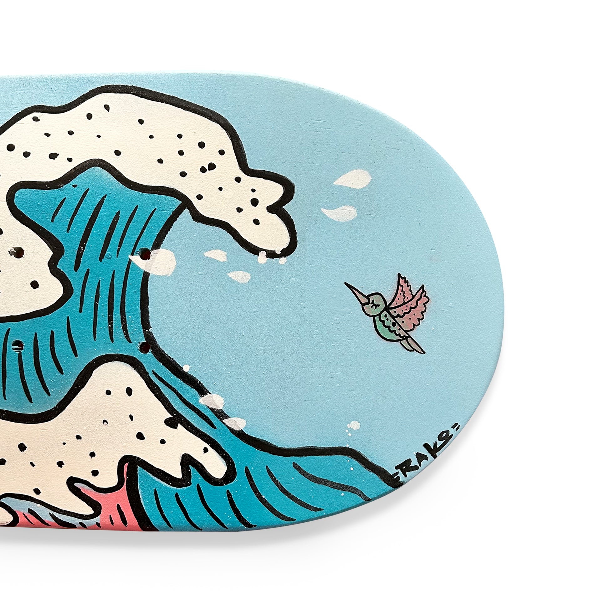 Skateboard pintada a mano con spray y esmalte.