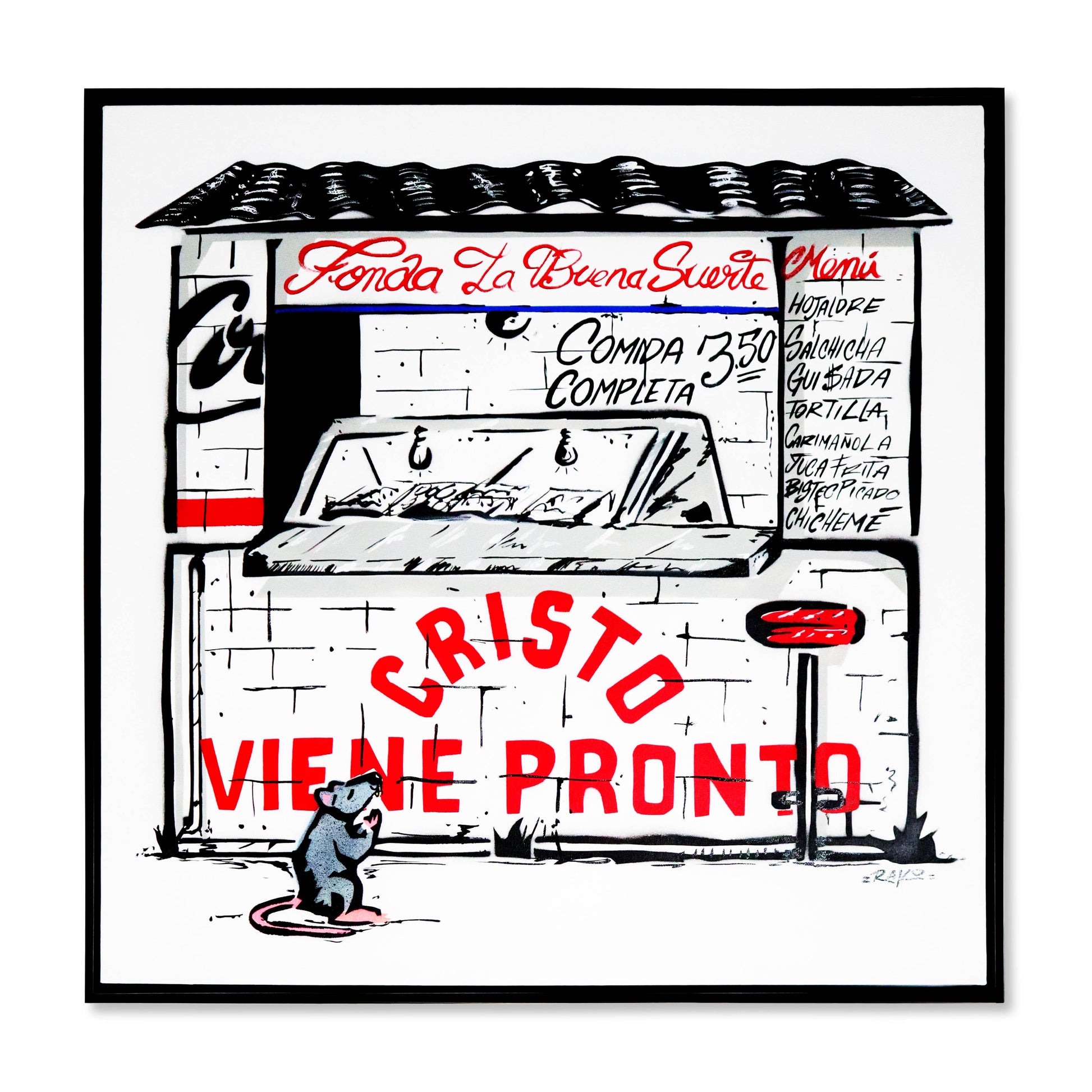 Arte pintado con spray usando técnica de stencil sobre canvas. Tamaño 90 cm x 90 cm. Marco Negro Flotante.